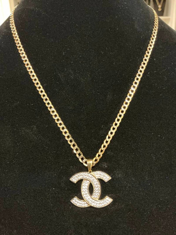 CADENA CUBANA CORTE BRILLO DE 2 TONOS 10K GROSOR 5.5 mm 22 INCH CON DIJE SÓLIDO COCO CHANEL CON ZIRCONIA