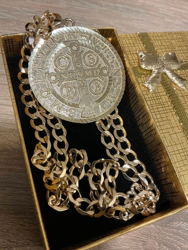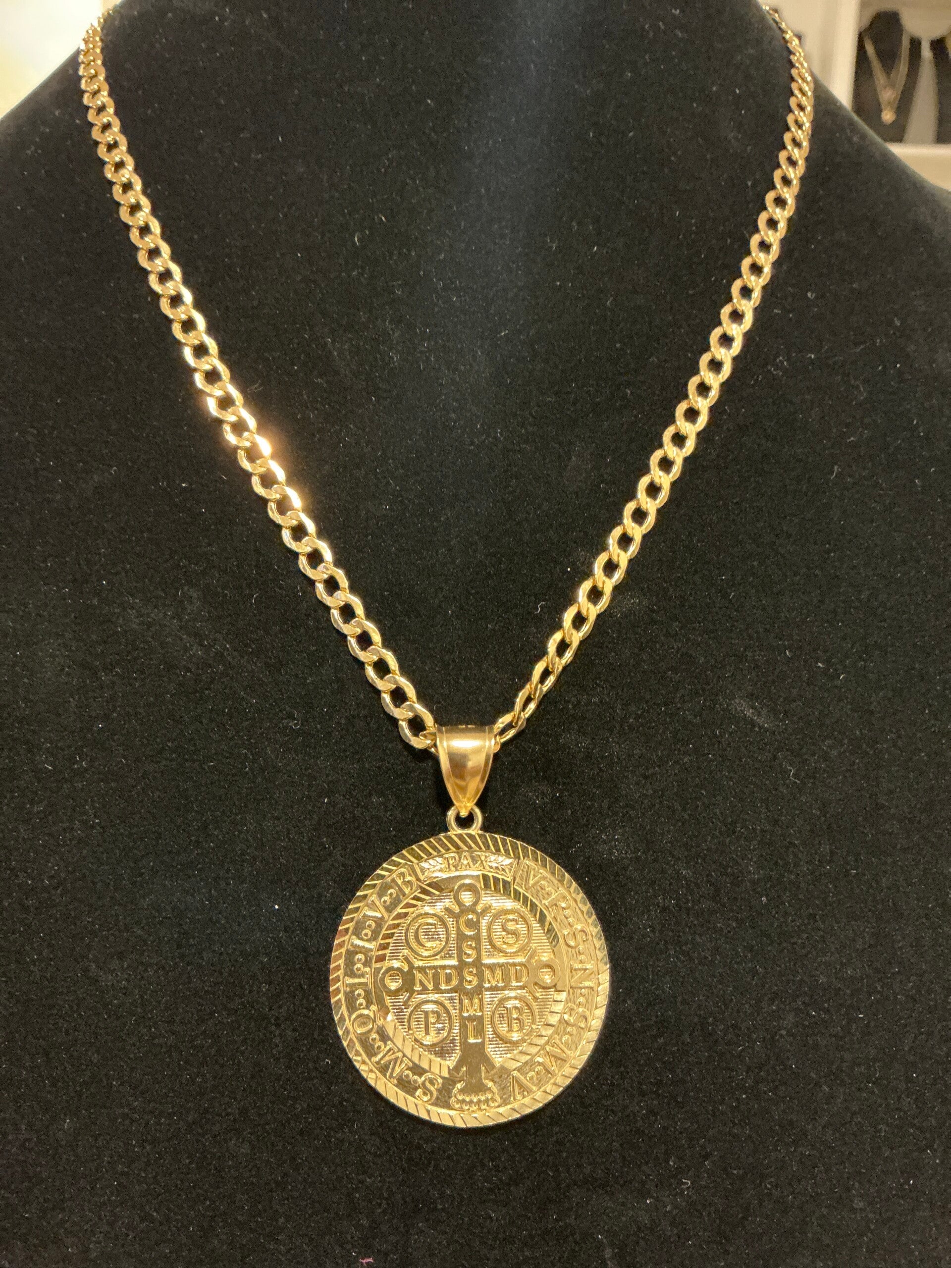 CADENA CUBANA 14k MARTILLADA GROSOR 6.6mm 22 INCH Y MEDALLA 10k DE SAN BENITO CON ALTURA 55 mm CON LA ALGOLLAS DIAMTRO 40mm